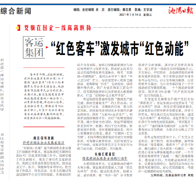 7月14日,沈陽日報(bào)以《 “紅色客車”激發(fā)城市“紅色動能”》為題報(bào)道了沈陽客運(yùn)集團(tuán)以黨建為引領(lǐng),助推企業(yè)高質(zhì)量發(fā)展之新變化。