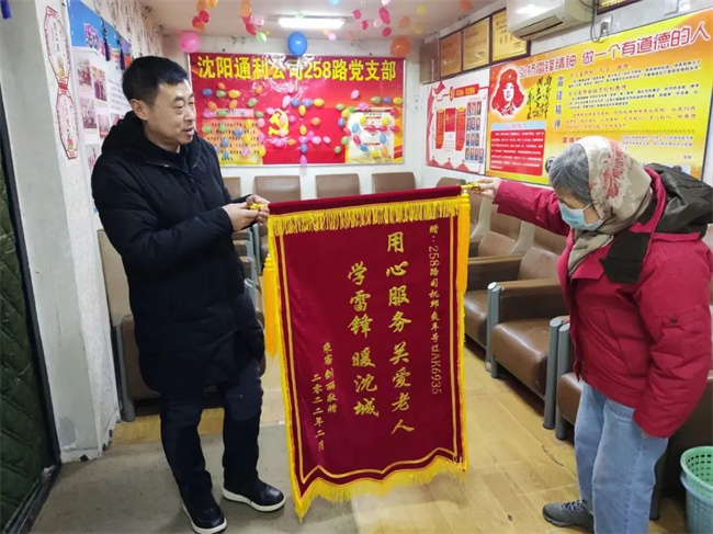 錦旗上寫的是“用心服務(wù)學(xué)雷鋒 關(guān)愛老人暖沈城”。
