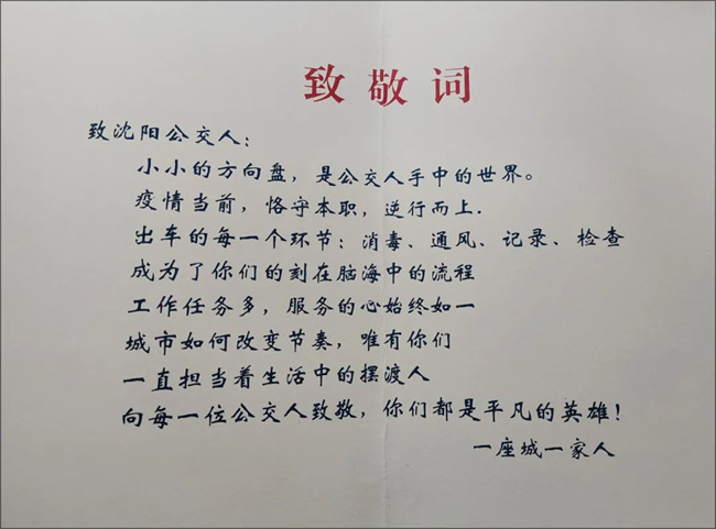 沈陽(yáng)家書(shū)致敬信致敬詞這樣寫(xiě)著:沈陽(yáng)公交人小小的方向盤(pán)是公交人手中的世界,疫情當(dāng)前,恪守本職,逆行而上。出車(chē)前的每一個(gè)環(huán)節(jié),消毒通風(fēng)記錄檢查,成為了你們刻在腦海中的流程,工作任務(wù)雖然多,但服務(wù)乘客的心始終如一。不管城市如何改變節(jié)奏,唯有你們一直擔(dān)當(dāng)著生活中的擺渡人,向每一位公交人致敬!你們都是平凡的英雄!
