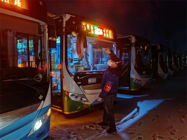 各車隊駕駛員提前到崗,一邊清理公交車上的積雪,一邊做好各項檢查工作,首班車均準時發(fā)出。車隊管理人員對每一位出車的駕駛員做好安全叮囑工作,要求駕駛員謹慎慢行,督促駕駛員規(guī)范佩戴口罩,做好個人防護,對運營車輛地面及扶手進行一圈一消毒,一圈一通風,做好安全保障和疫情防控工作。