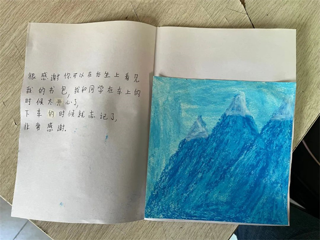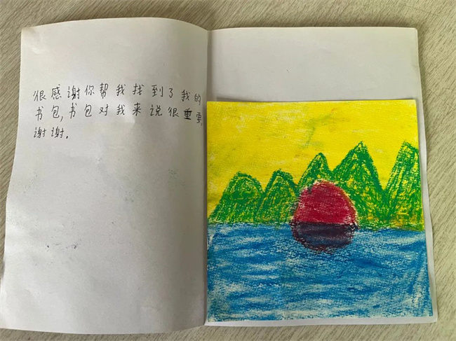 打開這封信,是一封由小朋友自己親手制作的感謝信,信中寫道:“很感謝你在后座上看見我的書包,我和我的同學(xué)在車上的時候太開心了,下車時就忘記了,非常感謝。”“很感謝你幫我找到了我的書包,書包對我來說很重要,謝謝?!?/p>