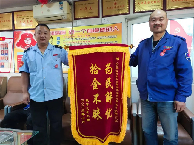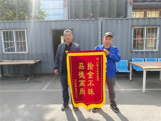 10月7日,一名乘客帶著寫有“拾金不昧 品德高尚”的錦旗來到211.222路車隊(duì),以此表達(dá)對駕駛員彭軍的感激之情。