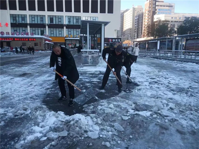 清掃公交場區(qū)積雪,保障車輛安全行駛。