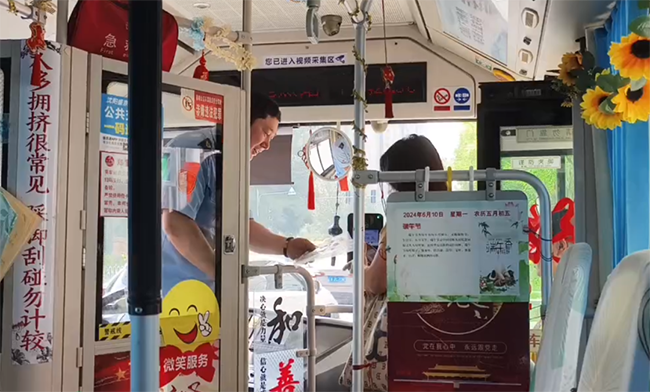 260路四星級駕駛員繆立眾早早來到工作崗位,做好出車前各項(xiàng)準(zhǔn)備工作的同時(shí),還將提前準(zhǔn)備好的五彩繩、香包、葫蘆等寓意平安、健康的小禮物擺放在駕駛室。每到一站,他都起身微笑著向上車的乘客送上祝福,并將小禮物贈送給每一位乘客。收到祝福的乘客們充滿了驚喜和感動(dòng),紛紛豎起大拇指,對這位駕駛員的暖心舉動(dòng)贊不絕口。