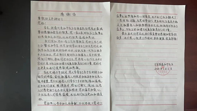 王卉珊的暖心善舉讓文官街道和平社區(qū)的書記深受感動(dòng),社區(qū)書記特地寫了一封感謝信,來到212路車隊(duì)親手交到王卉珊手中,向王卉珊表示最誠摯的謝意和崇高的敬意。