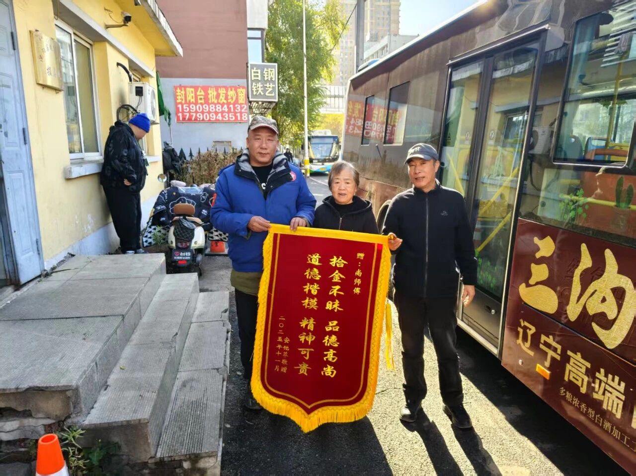次日清晨,好消息如期而至。失主安女士手持錦旗專程趕到車隊(duì)駐地,一見到尚麒麟便緊緊握住他的手:“發(fā)現(xiàn)包不見時(shí)我急壞了!這錢是剛從銀行取出應(yīng)急用的,要是丟了真不知如何是好。”錦旗上“拾金不昧品德高尚 道德楷模精神可貴”的金色大字,映照著她激動(dòng)的面容,“太感謝尚師傅了,您幫我挽回了重大損失!”