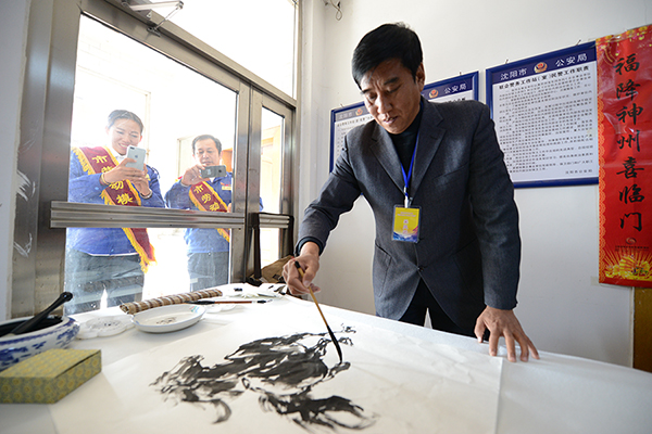 文藝演出后,書畫藝術(shù)家們與集團(tuán)公司勞動(dòng)模范、星級(jí)駕駛員在通利公司一樓大廳進(jìn)行了書畫藝術(shù)交流,現(xiàn)場(chǎng)展示了藝術(shù)家書法、繪畫創(chuàng)作全過程,讓駕駛員們親身感受書畫創(chuàng)作的藝術(shù)魅力。