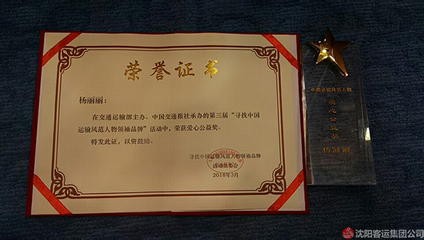 3月23日,第三屆“尋找中國(guó)運(yùn)輸風(fēng)范人物領(lǐng)袖品牌”活動(dòng)在北京國(guó)家交通運(yùn)輸部揭曉最終評(píng)選結(jié)果,來自沈陽客運(yùn)集團(tuán)有限公司黃河公共汽車分公司的210路駕駛員,沈陽市勞動(dòng)模范楊麗麗同志榮獲“中國(guó)運(yùn)輸風(fēng)范人物愛心公益” 獎(jiǎng)項(xiàng),為沈城公交行業(yè)爭(zhēng)得了榮譽(yù)。