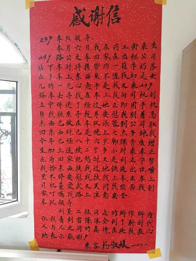 9月11日上午,乘客楊淑媛的女兒把感謝信親自送到康利公司239路車隊站務(wù)室,感謝駕駛員劉立寧、董愛武對自己母親的暖心幫助。