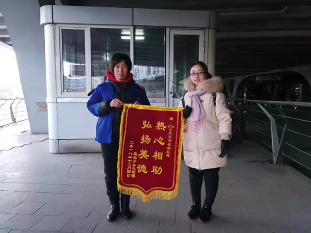 次日,盧女士懷著激動(dòng)的心情,手里捧著錦旗來到龍之夢(mèng)終點(diǎn)站,親自將錦旗交給了楊紅艷手中并合影留念。